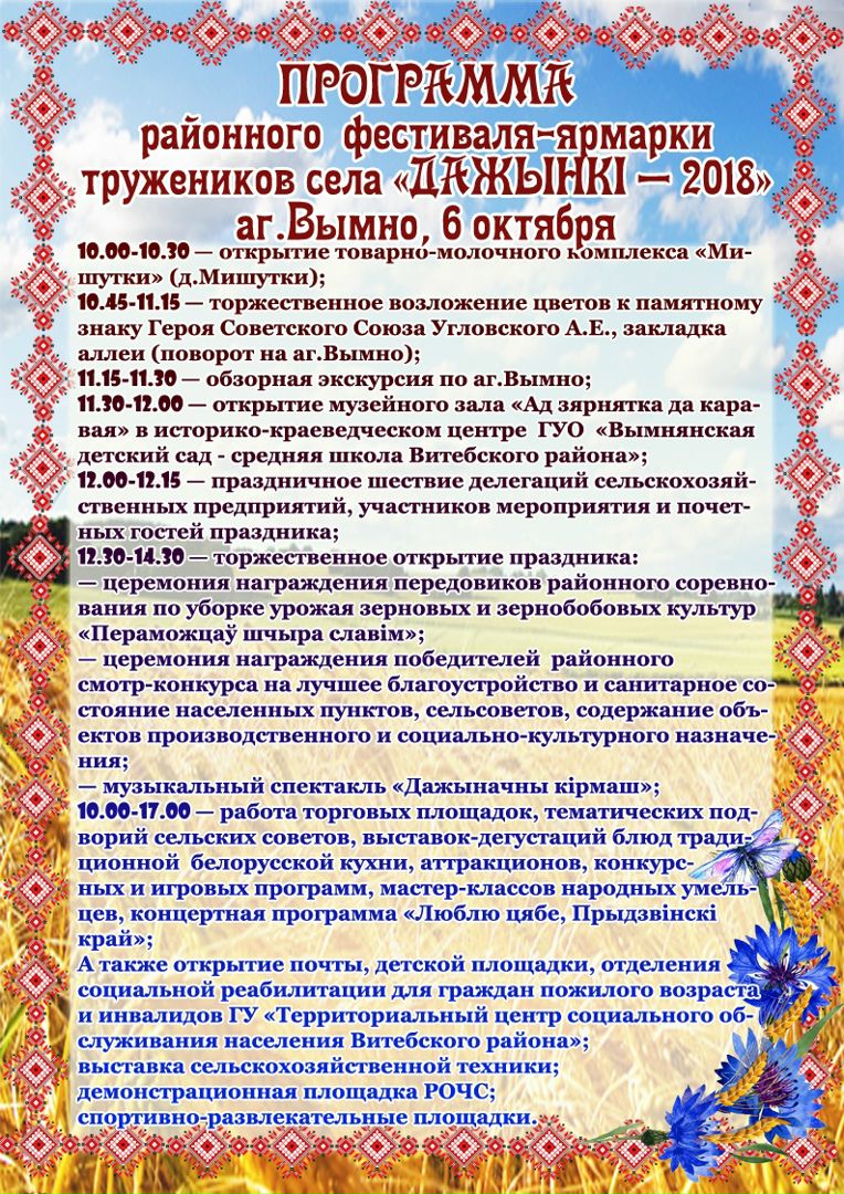К районному фестивалю-ярмарке «Дажынкі‑2018», который запланирован на 6 октября, активно готовится агрогородок Вымно Витебского района.